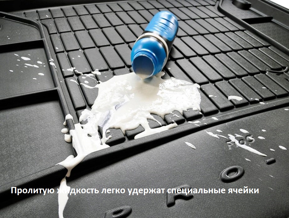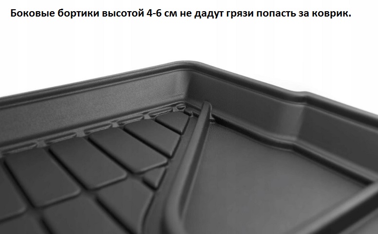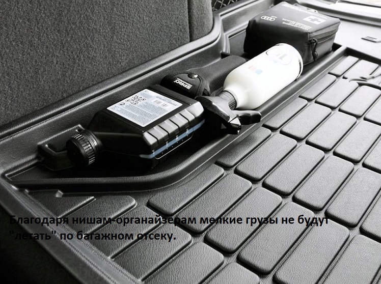 Во-вторых, это одна из самых высоких степеней защиты багажного отсека. Боковые бортики высотой в 4-6 см могут удержать внутри багажника большое количество грязи и влаги. А если в багажнике случайно прольется много жидкости, специальная глубокая ячеистая центральная часть не позволит жидкости перекатываться по багажнику.